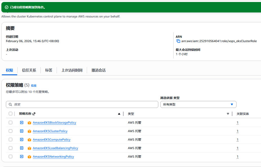 eksClusterRole。在 权限 (Permissions) 选项卡下,点击